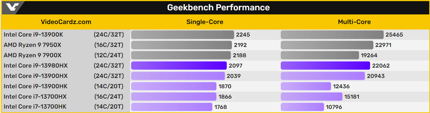 W trybie Multi-Core 32-rdzeniowy Core i9-13980HX zdołał jednak pokonać 24-rdzeniowego Ryzena 9 7900X. Wynik procesora Raptor Lake wyniósł 22 062 pkt. Niemal udało się jej dorównać 32-wątkowemu desktopowemu układowi R9 7950X. Natomiast Core i9-13900K z 32 wątkami poszedł daleko do przodu z wynikiem 25 465 pkt.