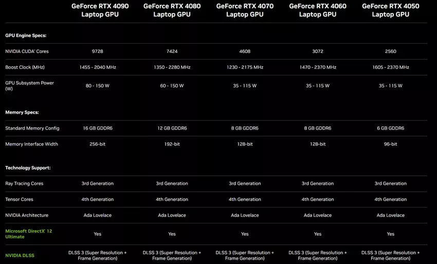 Jest jeszcze kilka parametrów, które są wspólne między nowymi produktami. W szczególności wszystkie obsługują ray tracing trzeciej generacji, mają rdzenie tensorowe czwartej generacji i mają DLSS 3. Należy również zwrócić uwagę na wsparcie dla DirectX 12 Ultimate.