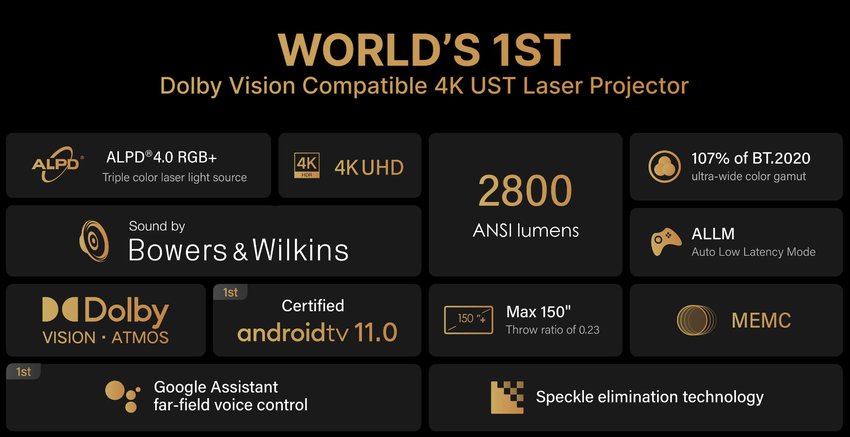 Formovie THEATER, premierowy potrójny projektor Ultra Short Throw (UST), jest wyposażony w najnowszą technologię potrójnego lasera ALPD RGB+ i jest połączony ze specjalnie zaprojektowanym systemem dźwiękowym Bowers & Wilkins, aby zapewnić wyjątkową kombinację obrazu i wydajności dźwięku. Jako projektor 4K UST z Dolby Vision, może dostarczyć autentycznych wrażeń kinowych w domu. Dzięki systemowi Android TV 11 i sterowaniu głosowemu Google Assistant w dalekim polu Formovie THEATER umożliwia oglądanie programów z serwisów streamingowych takich jak Youtube, Amazon Prime Video, Hulu, HBO Max, Disney+ bez konieczności korzystania z dodatkowego urządzenia.