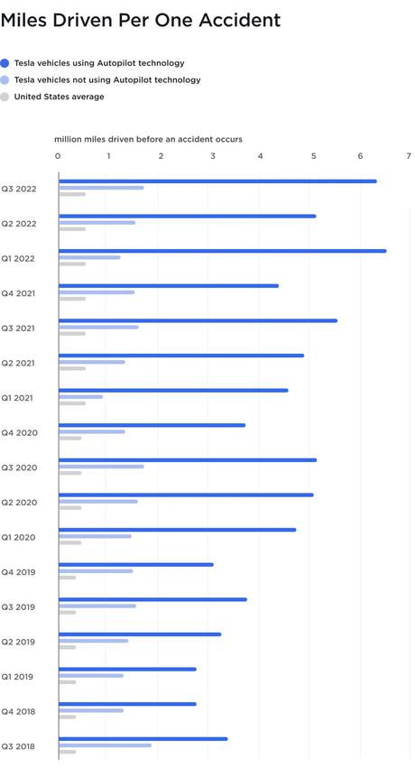 Na koniec trzeciego kwartału samochody elektryczne Tesli uczestniczyły w wypadku tylko raz na 6,26 mln przejechanych mil (10 mln km) przy aktywnym systemie wspomagania kierowcy. Przy wyłączonym automatycznym pilotażu samochody Elona Muska uczestniczyły w wypadku co 1,71 mln mil (2,75 mln km).