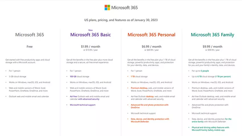 Subskrypcja będzie dostępna na całym świecie od 30 stycznia i zaoferuje użytkownikom 100 GB pamięci masowej w chmurze OneDrive z pozbawionym reklam interfejsem internetowym Outlook oraz zaawansowanymi funkcjami bezpieczeństwa (takimi jak skanowanie linków i załączników pod kątem wirusów). Dotychczasowi klienci OneDrive z 100 GB pamięci masowej zostaną automatycznie uaktualnieni do Microsoft 365 Basic w tej samej miesięcznej cenie 1,99 USD.