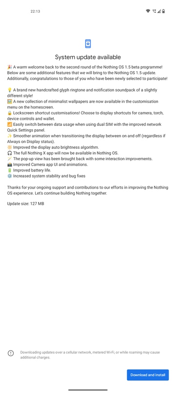 Firmware wyszedł z powłoką Nothing OS 1.5.1. Zawiera on nową minimalistyczną tapetę, konfigurowalne skróty ekranu blokady, nowy dzwonek z interfejsem Glyph, ulepszony panel szybkich ustawień sieci, płynniejsze animacje podczas włączania i wyłączania ekranu, ulepszony algorytm automatycznej jasności, ulepszone animacje UI i aplikacji aparatu oraz poprawiony czas pracy na baterii. Deweloperzy pracowali również nad bezpieczeństwem i prywatnością urządzenia.