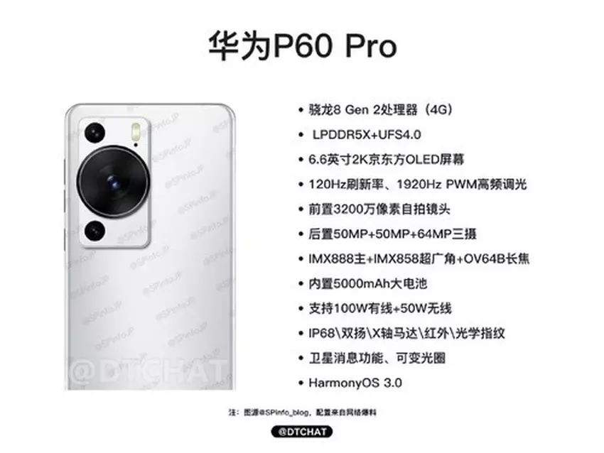 Nowość otrzyma także ochronę IP68 oraz baterię o pojemności 5000 mAh ze wsparciem dla ładowania przewodowego 100W i bezprzewodowego 50W. Jeśli chodzi o główny aparat, to otrzyma on trzy sensory: 50 MP Sony IMX888, 50 MP Sony IMX858 oraz 64 MP OmniVision OV64B. Huawei P60 Pro będzie dostarczany z systemem operacyjnym HarmonyOS 3.0.