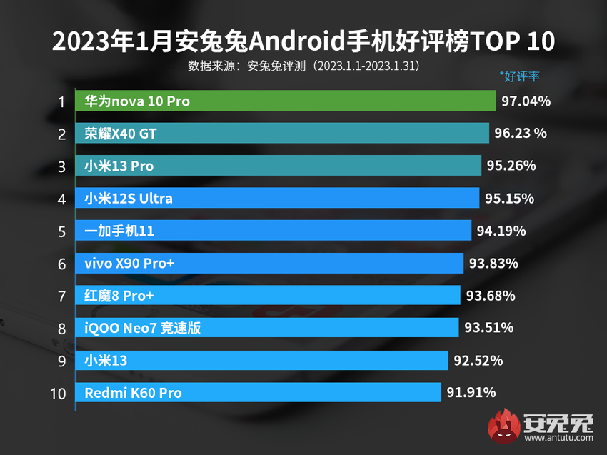 1. miejsce zajął Huawei nova 10 Pro, a 2. Honor X40 GT. W pierwszej trójce znalazł się flagowy smartfon Xiaomi 13 Pro, któremu udało się pokonać Xiaomi 12S Ultra. Debiutancki model firmy z aparatem Leica znalazł się na 4. pozycji, a niedawny OnePlus 11 na 5. Przy okazji OnePlus 11 był najwydajniejszym smartfonem początku 2023 roku według AnTuTu.