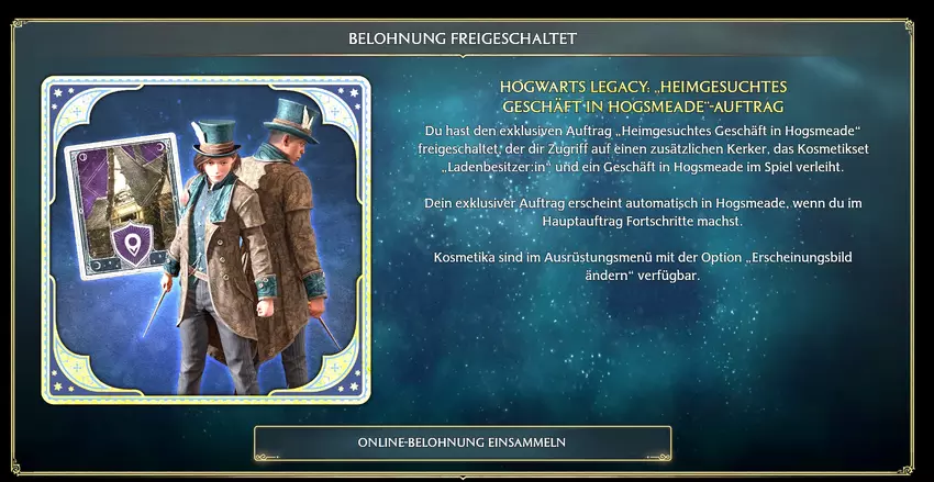 Użytkownicy Reddita uzyskali dostęp do questu Haunter Hogsmeade Shop, zestawu nowego wyglądu postaci oraz przepisu na eliksir Felix Felicis, który był dostępny przy zamówieniu gry w przedsprzedaży. Otworzyli też dostęp do lochu questów i prywatnego sklepu w Hogsmeade, gdzie można sprzedawać przedmioty z zyskiem.