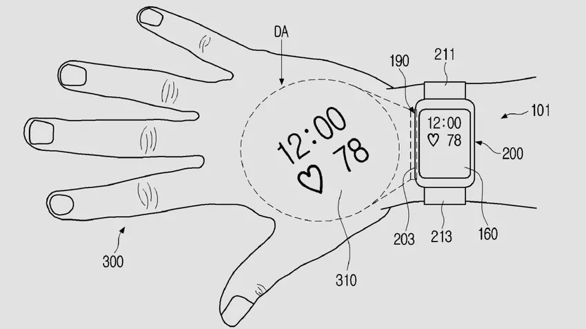 Projektor wyświetla obraz na grzbiecie ręki użytkownika. Może to być ekran zegarka, informacje o czasie, przychodzących powiadomieniach, zdjęcie lub wideo. Patent opisuje, że projektor może "wyświetlać informacje inne niż te wyświetlane na module wyświetlacza".