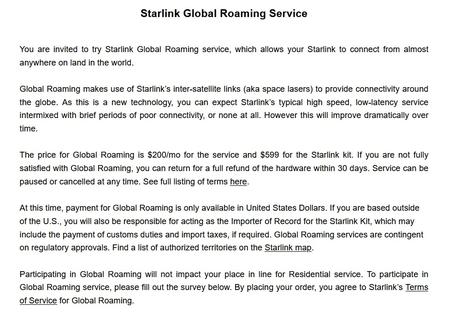 Mimo to media donoszą, że Starlink oferuje usługę globalnego roamingu niektórym użytkownikom spoza obszaru zasięgu firmy, na przykład na Grenlandii.