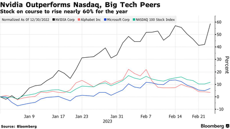 Akcje firmy NVIDIA wzrosły o 13 procent podczas notowań w dniu 23 lutego 2023 roku. Spowodowało to wzrost kapitalizacji rynkowej o 65 miliardów dolarów do 582 miliardów dolarów. Analitycy szacują, że jeśli trend się utrzyma, to do końca 2023 roku zielony gigant będzie droższy o 60 procent. W ciągu niespełna dwóch miesięcy od początku roku kapitalizacja wzrosła o 219 mld dolarów.