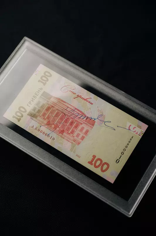 - 7 banknotów 100 UAH z unikalnymi numerami seryjnymi i podpisem prezesa Banku Narodowego Andrija Pyshnyya.