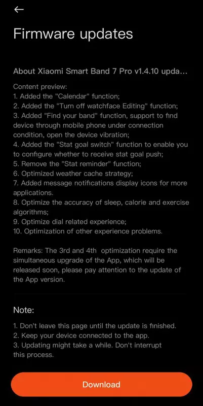 Firmware został wydany z numerem budowy 1.4.70. Według oficjalnej listy zmian, urządzenie zyskało wsparcie dla kalendarza. To znaczy, że użytkownicy będą mogli teraz przeglądać swój harmonogram bezpośrednio z ekranu gadżetu. Xiaomi dodało także do Smart Band 7 Pro funkcję Turn off watchface Editing, która usuwa losową edycję tarcz zegarka oraz możliwość odnalezienia bransoletki za pomocą smartfona.
