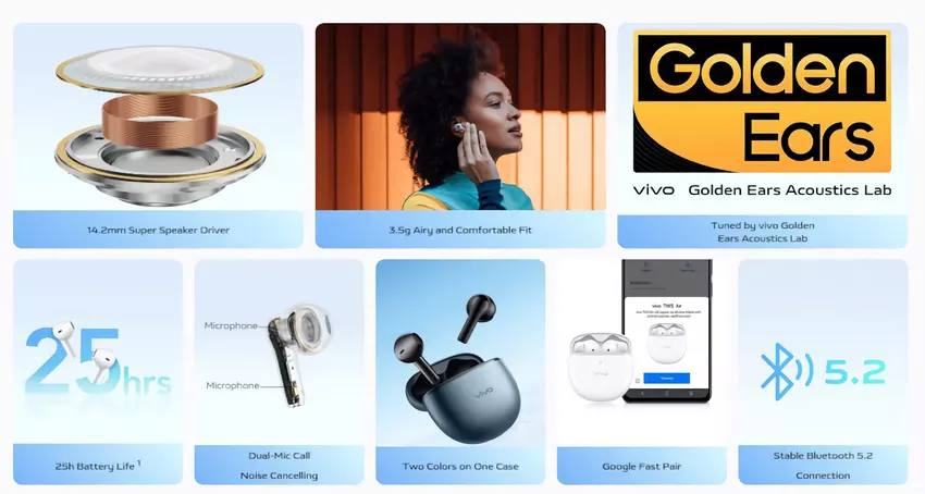 vivo TWS Air mają konstrukcję w stylu AirPods. Słuchawki mogą pochwalić się ochroną IP54, wagą 3,5 grama i 14,2-milimetrowymi przetwornikami. Vivo TWS Air wyposażone są w dwa mikrofony. Tłumią one hałas podczas rozmów. Ponadto słuchawki obsługują technologię dźwięku stereo DeepX 2.0, tryb audio o niskiej latencji oraz funkcję Google Fast Pair.