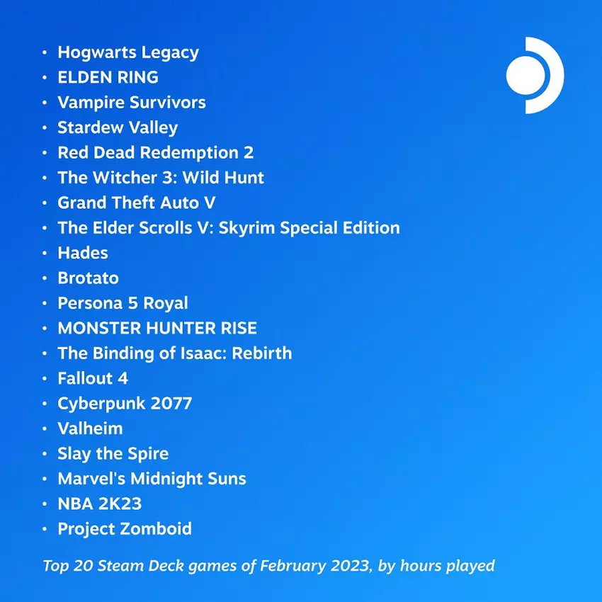 Hogwarts Legacy, Elden Ring i Vampire Survivors były najpopularniejszymi grami na Steam Deck w lutym