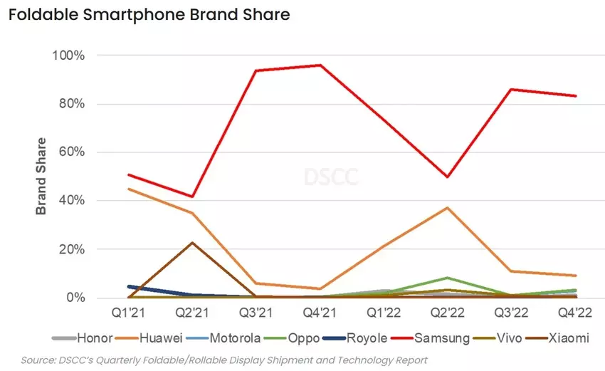 Samsung nadal jest zdecydowanym liderem rynku zginanych smartfonów, z ponad 80% udziałem w rynku