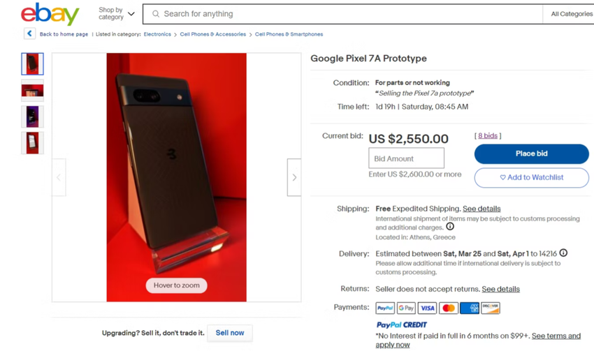 Pixel 7a pojawił się na aukcji eBay z ceną wywoławczą 1650 dolarów. Z czasem cena smartfona wzrosła o około półtora raza do 2550 dolarów. Od tego czasu prototypowe urządzenie zostało jednak wycofane z aukcji.