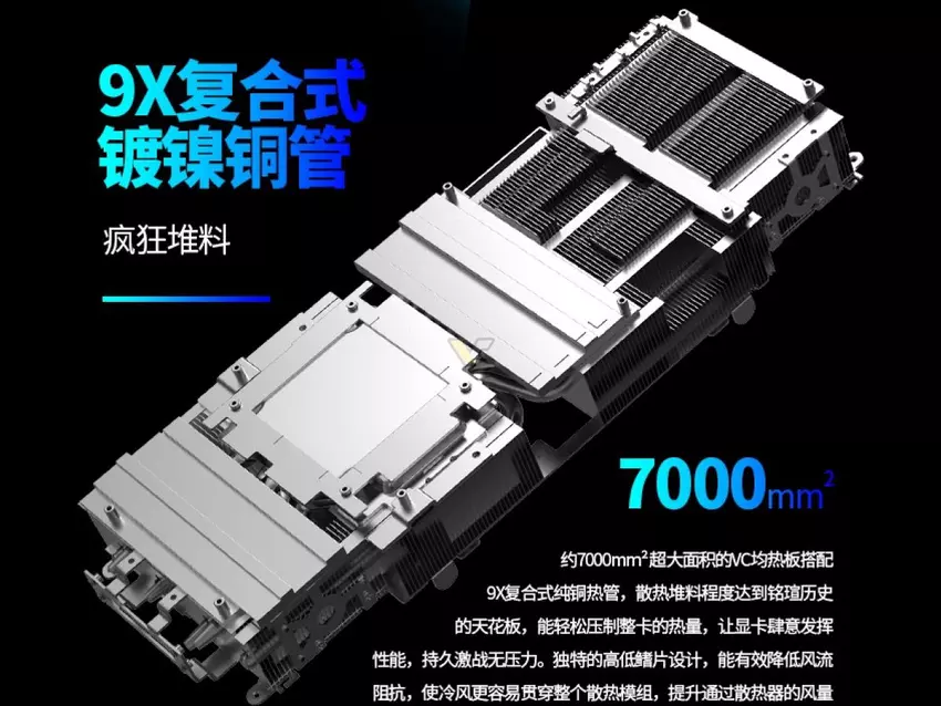 Obok dwóch kompaktowych wentylatorów znajduje się panel ARGB. Obudowa karty graficznej wykonana jest z metalu i pomalowana na szary kolor. Powierzchnia komory parowania wynosi około 7000 mm kwadratowych.