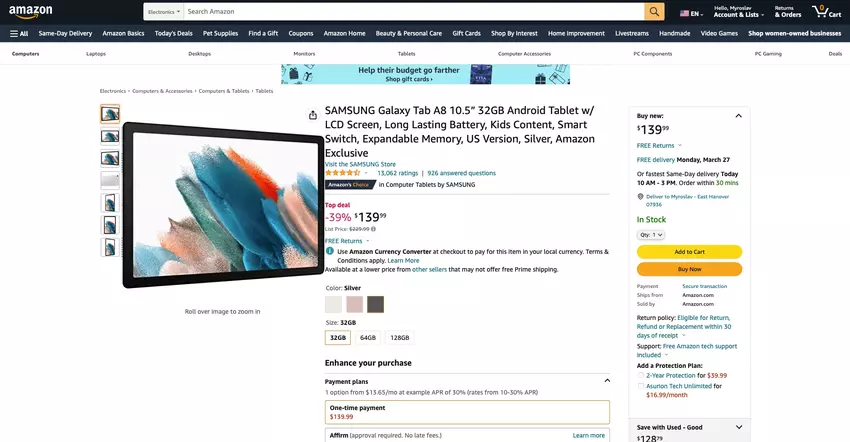 - Samsung Galaxy Tab A8 128GB - $232.00 dolarów $232.00 $232.00,99 $232.00.