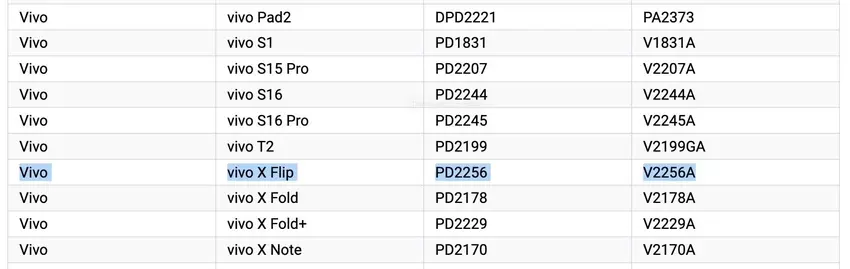 Przeciek potwierdza nazwę smartfona. Poza tym baza danych mówi, że vivo X Flip występuje z numerem modelu V2256A.