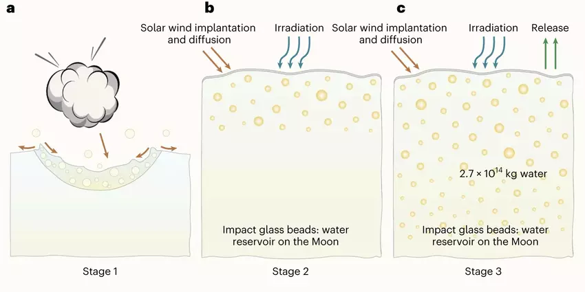 Można by ją wykorzystać nie tylko do zamieszkania przez ludzi na naturalnym satelicie, ale także do produkcji paliwa rakietowego. Współczesne teorie naukowe sugerują, że woda na Księżycu powstaje w wyniku wiatrów słonecznych, gdy jony wodoru łączą się z tlenem w regolicie. Chociaż część wody wyparowuje, szkło uderzeniowe może ją absorbować i magazynować.