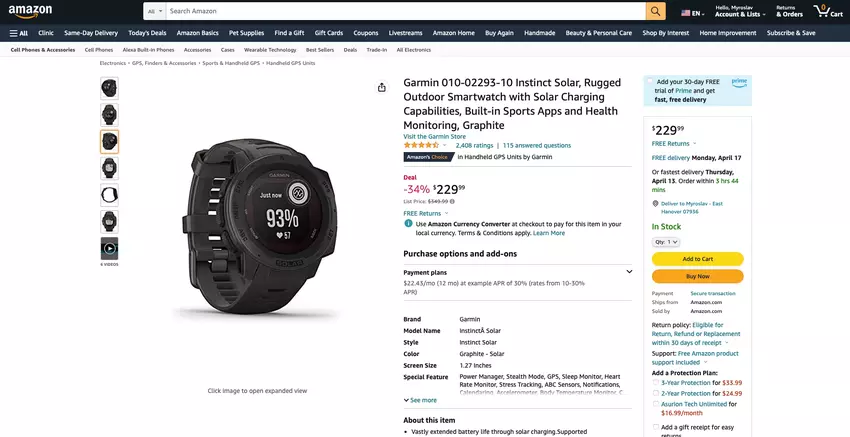Urządzenie można kupić na Amazonie za $216.99 $249.99, -13%. Gadżet ma odporną na wstrząsy obudowę i monochromatyczny wyświetlacz, który zapewnia dobrą widoczność w jasnym świetle słonecznym. Zegarek może śledzić różne sporty, a także monitorować tętno, puls, stres i wiele innych.
