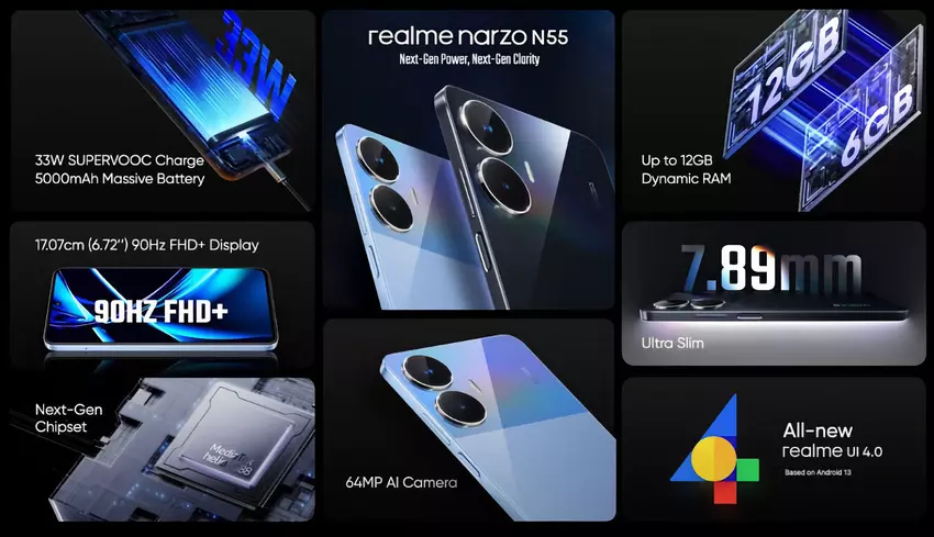 W pozostałych przypadkach realme narzo N55 jest taki sam. Smartfon posiada 6,72-calowy wyświetlacz LCD o rozdzielczości FHD+, częstotliwości odświeżania 90Hz oraz otwieraną przednią kamerę 8MP. Nowość została wyposażona w funkcję Mini Capsule (analogiczną do Dynamic Island w iPhone 14 Pro). Wyświetla ona powiadomienia, liczbę kroków, poziom naładowania baterii i inne. Smartfon pakuje również układ MediaTek Helio G88, do 6GB pamięci RAM, 128GB pamięci masowej, skaner boczny, baterię 5000mAh z ładowaniem 33W oraz aparat główny 64MP + 2MP.