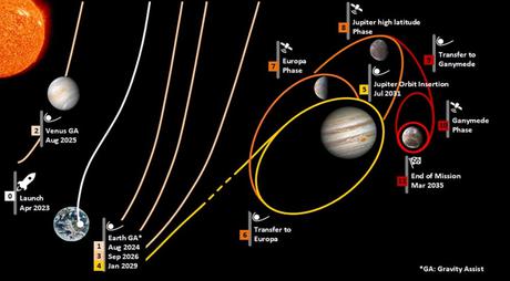 JIUCE będzie lecieć do gazowego giganta przez 8 lat i osiągnie orbitę do 2031 roku. Wynika to z faktu, że trasa stacji nie będzie przebiegać bezpośrednio z Ziemi na Jowisza. Statek kosmiczny będzie wchodził na orbity innych planet, aby przyspieszyć. Należy również pamiętać, że odległość między Jowiszem a Ziemią stale zmienia się w czasie.