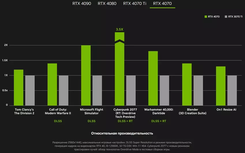 GeForce RTX 4070 jest przeznaczony do gier w rozdzielczości 1440p przy maksymalnych ustawieniach jakości obrazu. Podobnie jak inne modele next-gen, RTX 4070 otrzymuje wsparcie dla technologii generowania klatek DLSS 3.