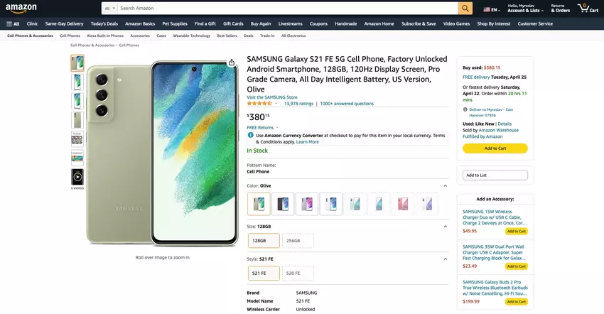 - Samsung Galaxy S21 FE Olive, 128GB - check price on amazon.