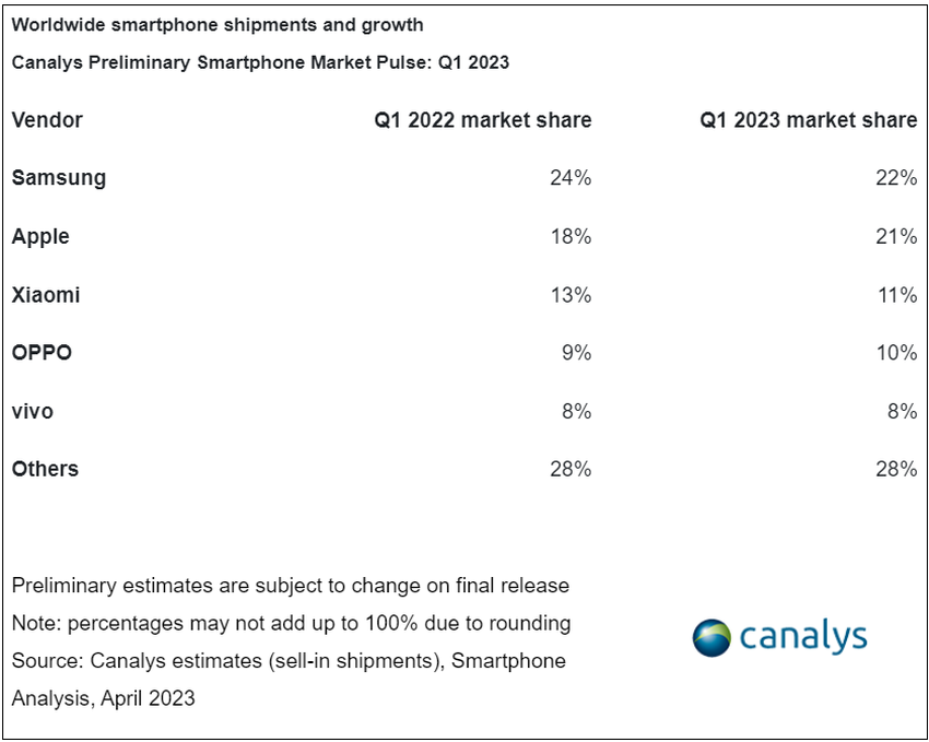 OPPO i vivo znajdują się w pierwszej piątce z udziałem odpowiednio 10% i 8%. Łączny udział wszystkich innych producentów w pierwszym kwartale 2023 roku wyniósł 28%. W porównaniu z tym samym okresem w 2022 roku, wskaźnik ten nie uległ zmianie.