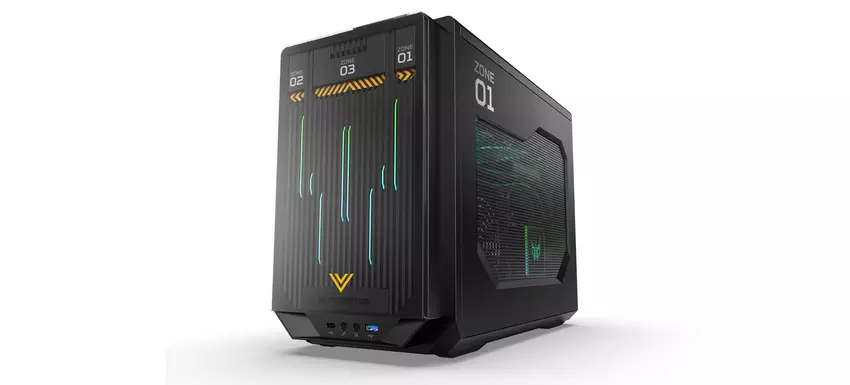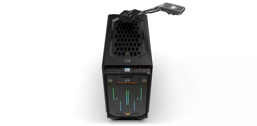 Obudowa komputera podzielona jest na trzy części. Największy obszar przeznaczony jest na procesor, pamięć RAM i dyski SSD NVMe. Drugi obszar przeznaczony jest na kartę graficzną, a w trzecim znajduje się system chłodzenia cieczą.