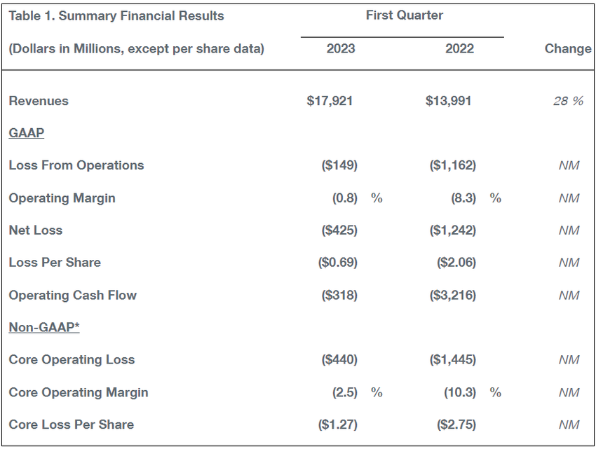 W raportowanym okresie przychody Boeinga wzrosły o 28% do 17,921 mld dolarów w porównaniu do 13,991 mld dolarów w pierwszym kwartale 2022 roku. Firma była w stanie dostarczyć 130 samolotów w ciągu trzech miesięcy w porównaniu do 95 rok wcześniej. Wygenerowały one przychód w wysokości 6,704 mld dolarów. Przychody w kategorii Defense, Space & Security wzrosły o 19% do 6,539 mld dolarów.