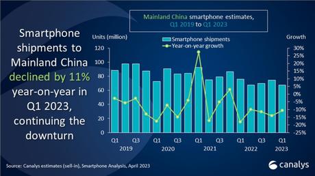 Chiński rynek smartfonów, podobnie jak rynek globalny, spadł w pierwszym kwartale 2023 roku w porównaniu z tym samym okresem ubiegłego roku. Wszystkie firmy z pierwszej piątki dostarczyły mniej urządzeń niż rok temu. W sumie rynek zmalał o 11%, z 75,6 mln do 67,6 mln smartfonów.