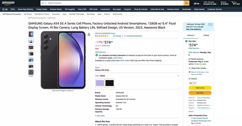 Mowa o modelu Galaxy A54. Smartfon z pamięcią 128 GB i w czarnym kolorze sprzedawany jest w cenie od check price on amazon do check price on amazon, co oznacza obniżkę o check price on amazon. Jeśli chcecie kupić urządzenie w kolorze fioletowym, taki model będzie kosztował więcej - check price on amazon99 dolarów.