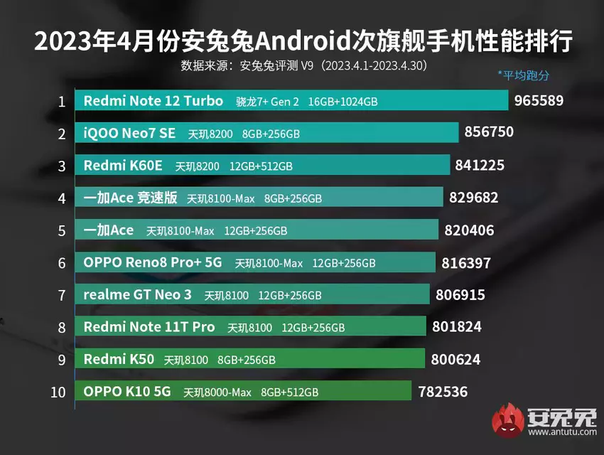 Po rankingach flagowców, AnTuTu opublikowało swoją listę dziesięciu najwydajniejszych smartfonów ze średniej półki. Drugi miesiąc z rzędu na czele znajduje się Redmi Note 12 Turbo, ale nawet przy drugim podejściu nie udało mu się osiągnąć granicy 1 miliona punktów.