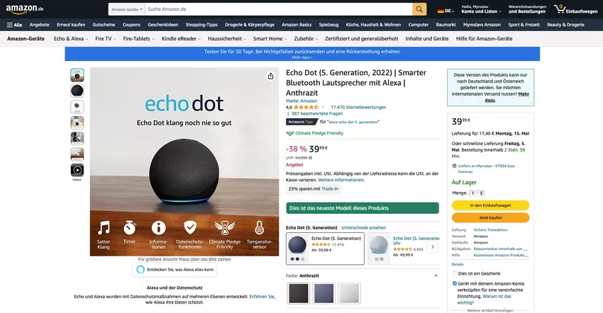 Amazon Echo Dot 5 Gen: inteligentny głośnik z czujnikiem ruchu, wbudowanym zegarem i Alexą za 39 euro