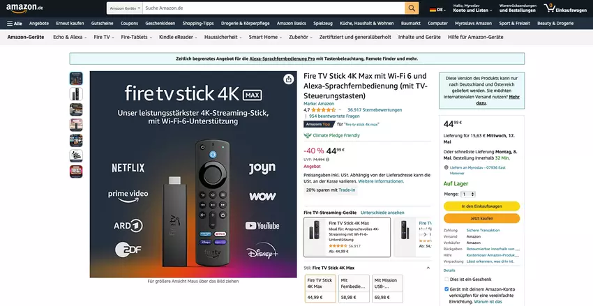30 euro taniej: dekoder Fire TV Stick 4K Max z Wi-Fi 6, HDR i Dolby Vision w sprzedaży na Amazon za 44,99 euro