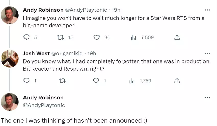 Według tweeta redaktora VGC, Andy'ego Robinsona, duże studio opracowuje kolejną, niezapowiedzianą grę strategiczną czasu rzeczywistego opartą na Star Wars.