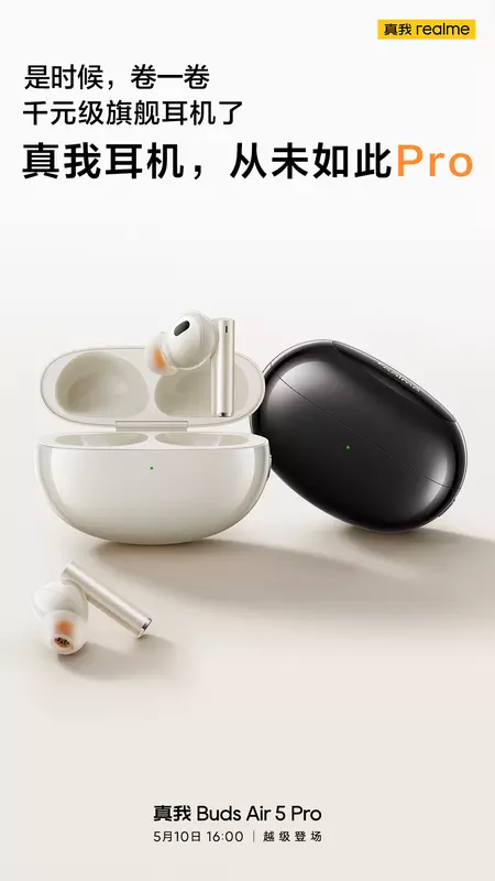 Chodzi o słuchawki Realme Buds Air 5 Pro TWS. Według plakatu firmy, nowe urządzenie zostanie odsłonięte 10 maja, razem ze smartfonami realme 11, realme 11 Pro i realme 11 Pro+. Słuchawki zostaną wprowadzone na rynek w kolorze czarnym i białym.