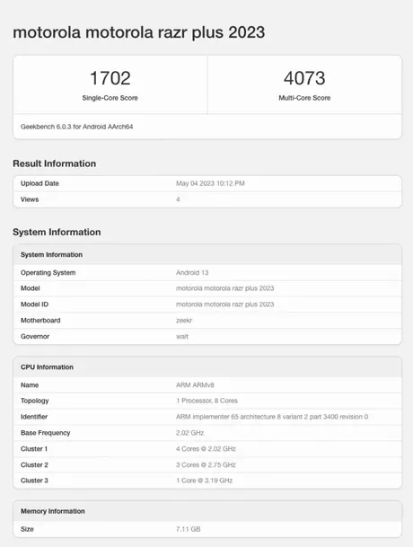Motorola Razr+ 2023 z wyginanym wyświetlaczem i Snapdragonem 8+ Gen 1 testowana w Geekbench.