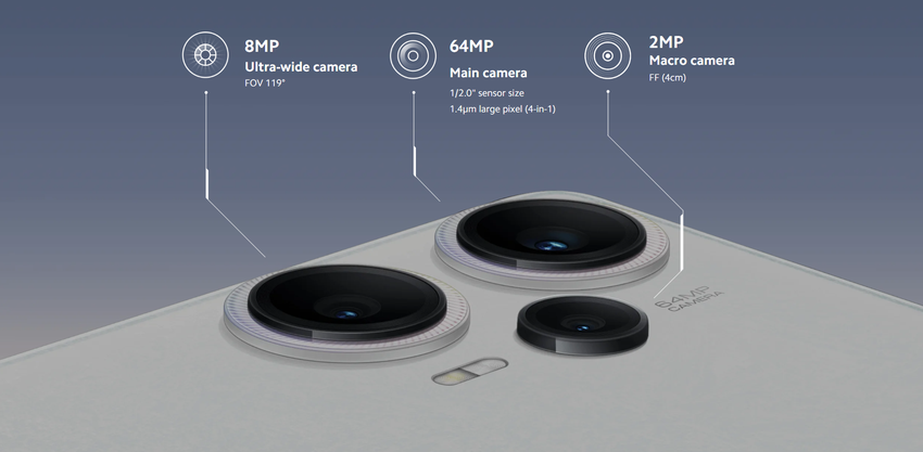 Rozdzielczość głównego aparatu to 64 MP + 8 MP + 2 MP. Nie posiada teleobiektywu, ale ma optyczną i elektroniczną stabilizację obrazu. Można kręcić wideo w 4K UHD, ale liczba klatek na sekundę jest ograniczona do 30 FPS.