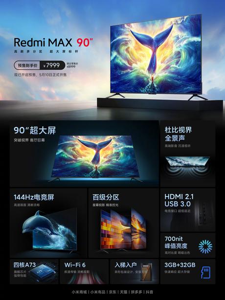 Mowa o telewizorze Redmi MAX. On również otrzyma 90-calowy wyświetlacz 4K przy 144 Hz. Panel wspiera podświetlenie ze 100 strefami i 4096 poziomami przyciemniania. Telewizor ma także czterordzeniowy procesor A73, 3GB RAM, 32GB ROM oraz głośniki stereo o mocy 30W. Nowość posiada funkcję Variable Refresh Rate (VRR), Auto Low Latency Mode (ALLM) oraz wsparcie dla Wi-Fi 6.