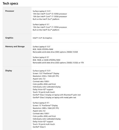 Surface Laptop 6 13,5" otrzyma układ Intel Core i5-1335U lub Core i7-1335U. Większa wersja będzie wyposażona wyłącznie w procesor Core i7-13355U. Niezależnie od konfiguracji podsystem graficzny będzie prezentowany przez zintegrowane GPU Iris Xe.