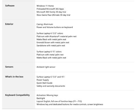 Model kompaktowy otrzyma 8/16 GB pamięci RAM LPDDR5x oraz dysk SSD o pojemności 256/512 GB. Microsoft Surface Laptop 6 15" otrzyma do 32GB pamięci RAM i do 1TB pamięci masowej.