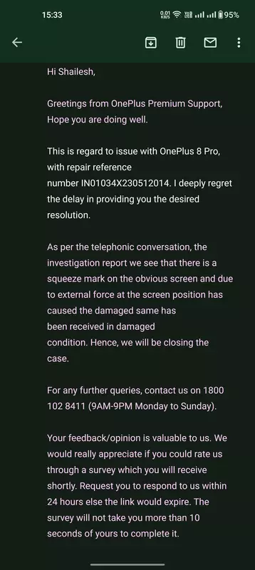 Właściciel OnePlus 8 Pro skontaktował się z zespołem wsparcia firmy i powiedziano mu, że przyczyną samozapłonu był "nacisk na płytę główną". Uważa on jednak, że ustalenia te są bezpodstawne i nalega na dokładniejsze zbadanie sprawy.