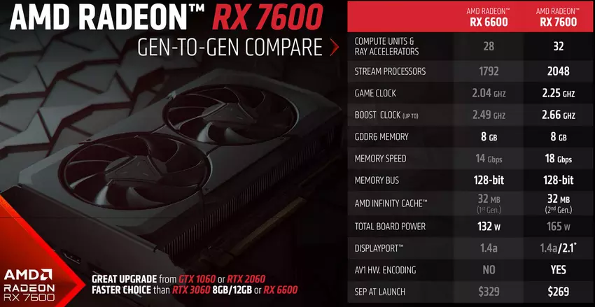 Radeon RX 7600 bazuje na układzie Navi 33 XL z 33 jednostkami wykonawczymi RDNA 3 i 2048 procesorami strumieniowymi. Referencyjna częstotliwość taktowania GPU wynosi 2,66 Hz.