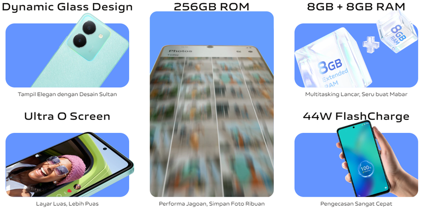 Niezależnie od modelu układu, smartfon wyposażony jest w 6,64-calowy wyświetlacz LCD Full HD+ z częstotliwością odświeżania 90 Hz. Rozdzielczość głównego aparatu wynosi 50 MP + 2 MP, podczas gdy przedni aparat ma 16 MP.