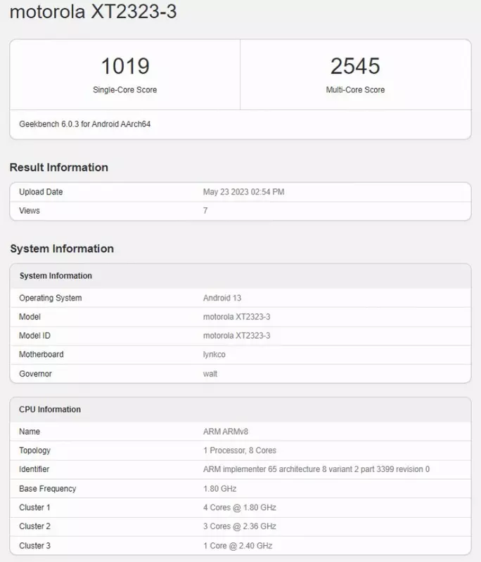 Niestety, nie ma żadnych innych szczegółów na temat smartfona w Geekbench, ale wiadomo, że gadżet będzie również wyposażony w dwa wyświetlacze: główny i mały dodatkowy na zewnątrz. Motorola Razr 40 otrzyma również podwójny aparat główny. Nawiasem mówiąc, nowość zostanie zaprezentowana wraz z topowym modelem Motorola Razr 40 Ultra.