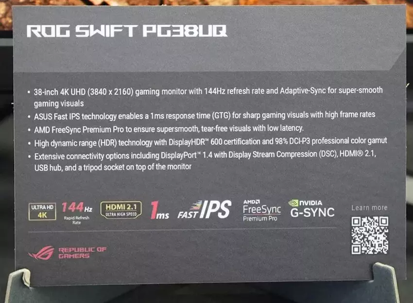 ASUS ROG Swift PG38UQ obsługuje HDR, AMD FreeSync Premium Pro i NVIDIA G-SYNC. Ekran wyświetla 98% gamy kolorów DCI-P3. Warto zauważyć, że w przypadku korzystania z HDMI 2.1 zamiast DisplayPort 1.4 liczba klatek na sekundę jest ograniczona do 120 Hz.