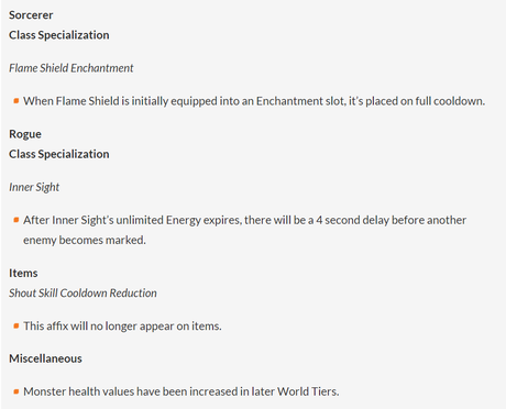 Wśród zmian, w pełni ujawnionych na poniższej liście, znalazły się zmiany w Płomiennej Tarczy Czarnoksiężnika, która teraz w pełni regeneruje się również po użyciu w specjalnym slocie: