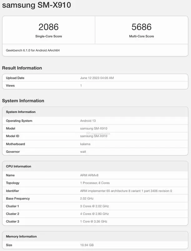 Nowość ma numer modelu SM-X910. Przeciek potwierdza wcześniejsze plotki. Gadżet będzie wyposażony w układ Snapdragon 8 Gen 2 dla Galaxy. Ten sam SoC znajduje się w smartfonach Galaxy S23. Różni się on od zwykłej wersji Snapdragon 8 Gen 2 podkręconą do 3,36 GHz częstotliwością rdzenia Prime. Tablet otrzyma również 12 GB pamięci RAM. Nowość będzie działać po wyjęciu z pudełka z systemem operacyjnym Android 13 i One UI 5.1 lub One UI 5.1.1.