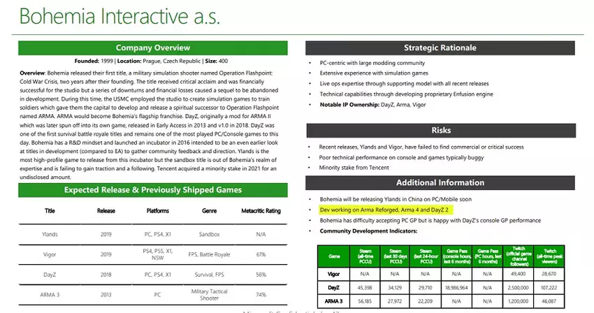 Dokument z 2021 roku wskazuje, że studio pracuje nad trzema projektami, z których dwa zostały zgłoszone przez deweloperów - Arma Reforged (aka Arma Reforger) i Arma 4. Większe zainteresowanie wzbudziła jednak trzecia gra - niezapowiedziany sequel popularnego niegdyś sieciowego symulatora przetrwania DayZ.